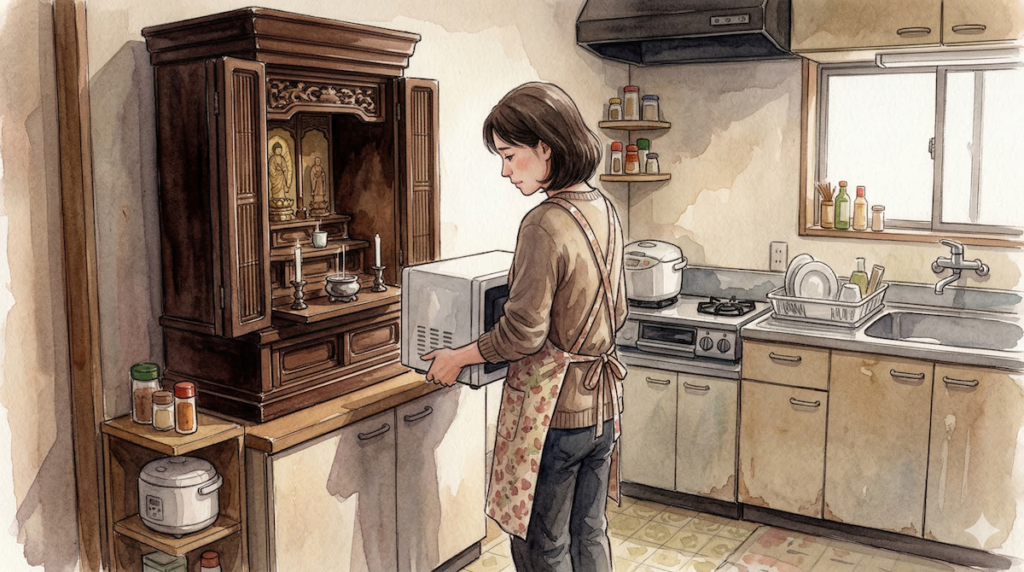 3. レンジの定位置を妻に返す 仏壇を移動させたら、妻が一番使いやすい場所に電子レンジを設置し、「あなたの生活が最優先だ」というメッセージを物理的な空間で証明してください。