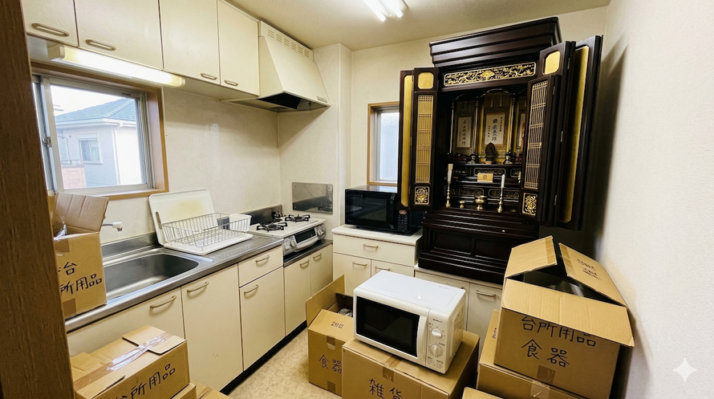 2DKという間取りは、夫婦二人が生活する上での「最小単位」とも言える広さです。リビング兼ダイニングキッチンは、二人が食事をし、くつろぎ、明日の活力を養うための「生の空間」です。そこに、大きな黒塗りの仏壇という「あの世と祈りの空間」が突然、圧倒的な質量で割り込んでくることの異様さを理解しなければなりません。