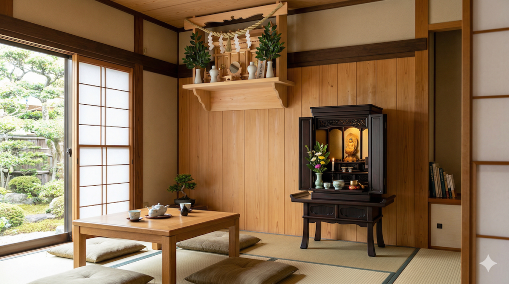日本の伝統儀礼において、神仏の優先順位は「神棚が先」です。同じ部屋に両方がある場合、まずは神棚に向かい「二礼二拍手一礼」で拝み、その後に仏壇へ向かって合掌するのが正式な順序と定義されています。