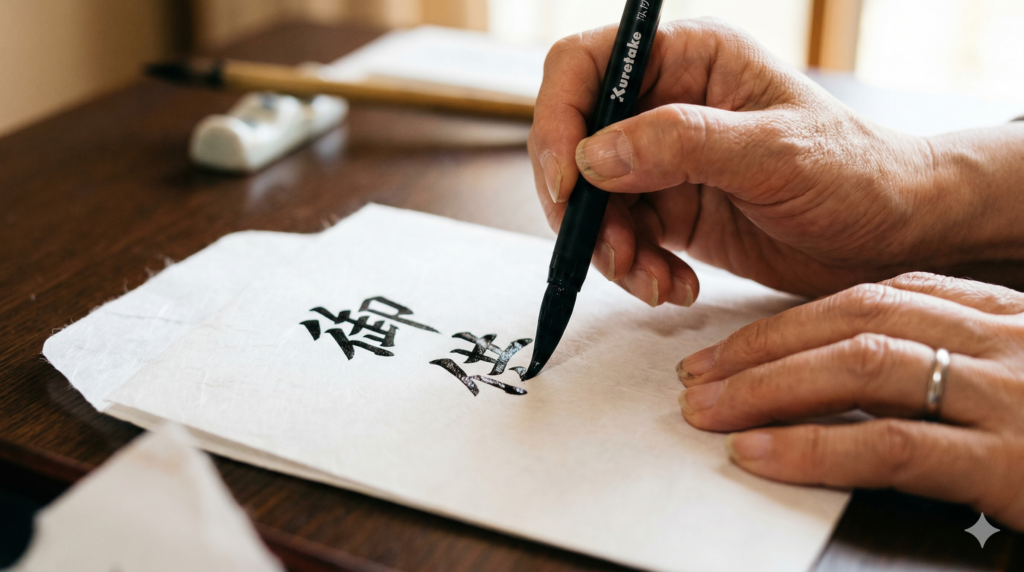筆ペンにたっぷりと黒を纏わせる瞬間。それは故人への「私は元気です」という力強い報告