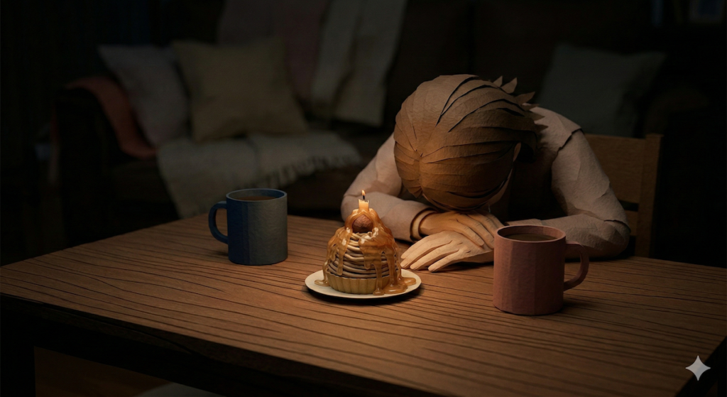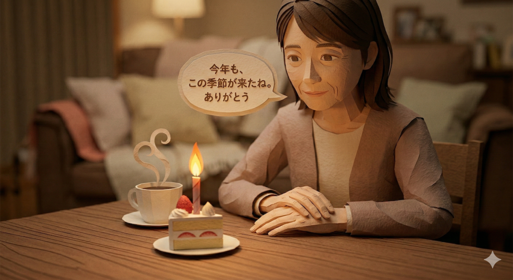 その時、ふと、あの人の「ありがとう、いただきます」という声が、耳の奥ではなく、心の一番柔らかい場所で聞こえた気がしました。おめでとう、なんて言えなくてもよかった。ただ、そのケーキを挟んで座るだけで、私たちは確かに、そこでもう一度出会っていたのです。