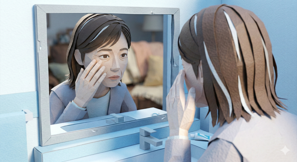 例えば、冬の朝。あなたは洗面台の冷たい鏡の前に立ち、自分の顔をじっと見つめます。目尻にまた一つ増えたシワ、ふと見つけた数本の白髪。自分の細胞が確実に老いに向かっていることを実感するその手触りの中で、突然、ハンマーで頭を殴られたような絶望感に襲われるのです。