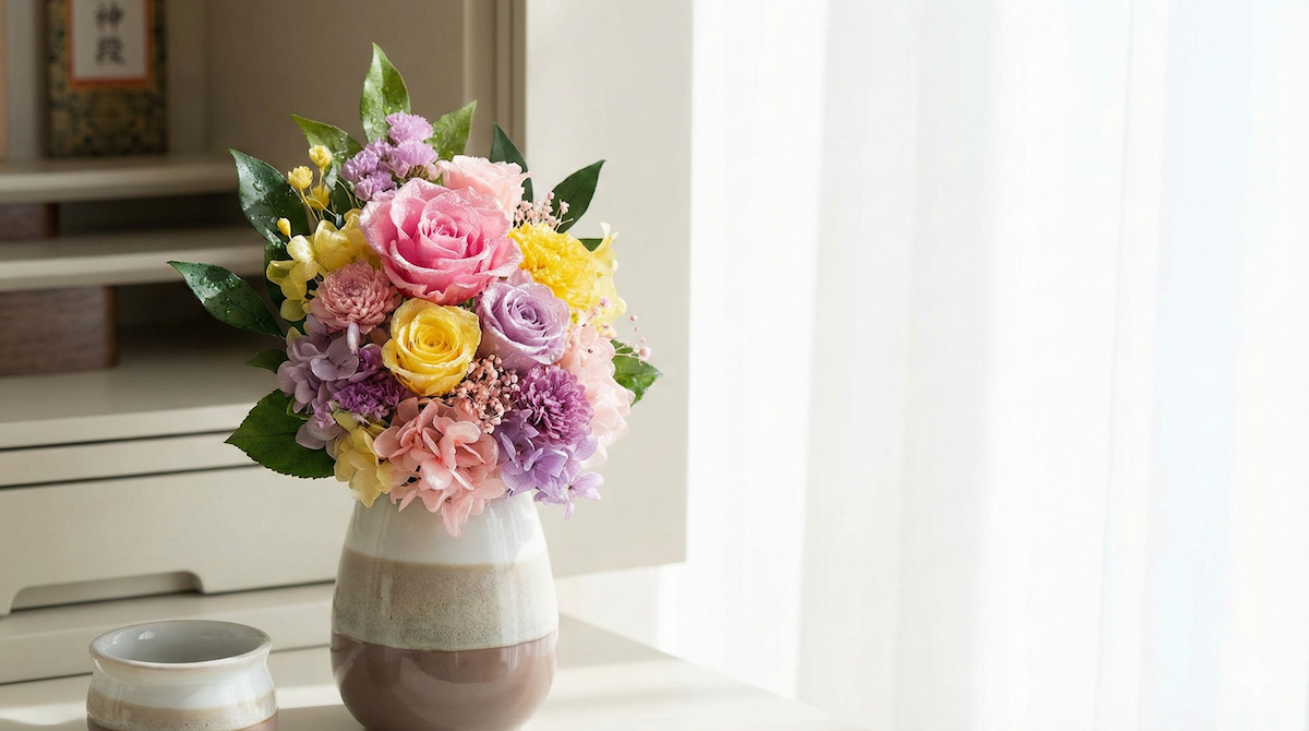 命日やお盆などの特別な日には、できるだけ「生花」も併せてお供えしましょう。プリザーブドフラワーは「日常の彩り」として活用するのがベストなバランスです。
