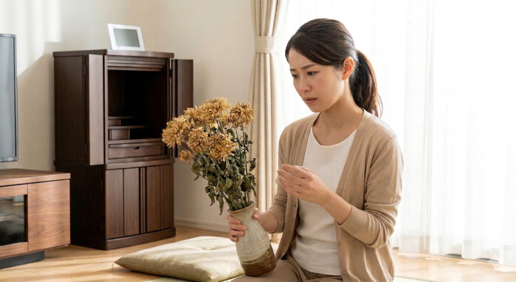 私たちは幼い頃から、「仏壇には生花をお供えするのが当たり前」と教わってきました。 だからこそ、お花を枯らしてしまったり、お手入れを負担に感じたりすると、まるでご先祖様を蔑ろにしているような「罪悪感」を抱いてしまうのですよね。
