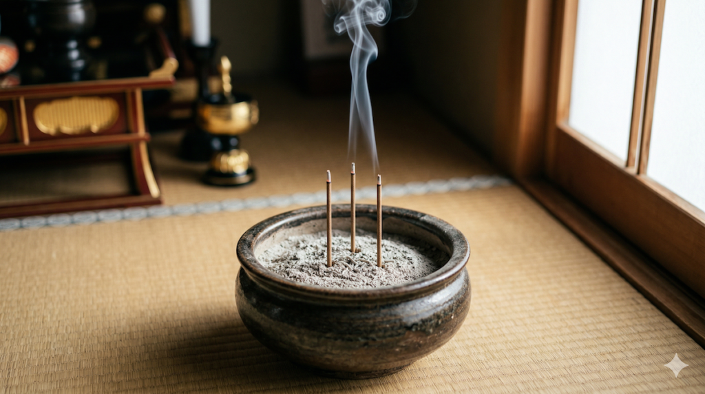 そのため、お線香は仏様への「食べ物」として立てるのではなく、極楽浄土の素晴らしい香りを現世で私たちが味わい、自分自身の心を清めるために使います。香炉の灰の上に寝かせることで、お線香は最後まで燃え尽き、芳しい香りを空間いっぱいに広げてくれます。決して「供養をサボっている」わけではなく、「すでに救われている」という圧倒的な安心感の表れなのです。